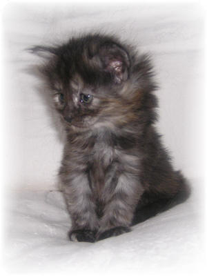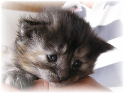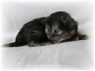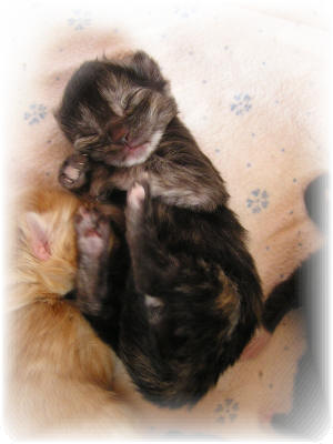 Ich bin das 2. Mädel in der Gruppe und hab bei meiner Geburt 106 g auf die Waage gebracht. Alle meinen, ich wäre eine tortie smoke, was auch immer das ist, na warten wir es mal ab. Morgen gibt es neue Bilder von uns, da kann man vielleicht auch den hohen Rotanteil bei mir und meiner Schwester auf dem Rücken sehen. ( 29.09.2007 ) |