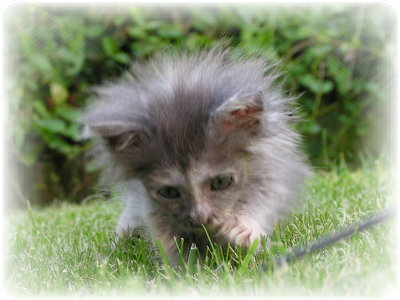Heute, mit 8,5 Wochen wiege ich zur Freude meiner Zweibeiner endlich 560 g! Zu unserer großen Überraschung durften wir zum ersten Mal in den Garten, ach was war das aufregend!!! Übrigens rufen mich hier alle Minni!