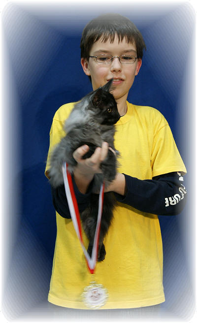 02./03.04.2011 Eisleben-Kloster Helfta Am 02. und 03.04.2011 startete unser Süßer in Eisleben in der Klasse 6 - 9 Monate. In vielerlei Hinsicht war dies eine Premiere. Wir hatten zuvor noch nie beim Delicat e.V. unsere Süßen vorgestellt, auch die meisten anwesenden Richter und Norwegerzüchter mit ihren Katzen kannten wir nicht. Und einen Lucifer im Kloster gab es sicherlich auch noch nie!!! Am Samstag wurde unser Süßer von Richterin I. Katser aus Russland gerichtet. Sie war total begeistert von Lucifer und dementsprechend fiel auch seine exzellente Bewertung im Richterbericht aus. Zu unserer großen Freude bekam unser Luci das Best in Colour und wurde nominiert für die Best in Show Halblanghaar. Dort stand er in Konkurrenz mit einem wunderschönen und riesigen blauen Maine Coon-Jungkater. Wir waren total erstaunt und auch super stolz auf unseren kleinen Lucifer, als sich die Richter einstimmig bei der Best in Show Halblanghaar für unseren Schatz entschieden! Am Sonntag wurde Lucifer von Richter H. Eckelmann aus Deutschland ( selber Norwegerzüchter ) gerichtet. Auch er war begeistert von unserem Süßen! Auch von ihm bekam er seinen Punkt mit exzellenten Bewertungen und wurde nominiert für die Best in Show Halblanghaar. Und wieder schaffte es unser Junior und bekam das Best in Show Halblanghaar! Luci, Luci... was machst Du nur? Wir sind unheimlich stolz auf Dich!!! Übrigens passierte genau das, was ich befürchtet hatte, am Sonntag Mittag stand eine Ordensschwester skeptisch vor unserem Käfig und beäugte abwertend das Nummern- und Namensschild von Lucifer! Wir kamen dann kurz ins Gespräch über Katzen und sie erklärte mir, dass sie den süßen schwarzen Kater am schönsten fand, der da so lieb an den Gitterstäben mit ihr schmuste! Nur gut, dass sie nicht wusste, das genau dieser Kater den so " unmöglichen " Namen Lucifer trug! ;)
