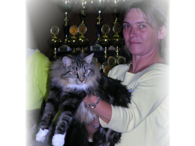 Wir, das sind mein Mann Ralf, unsere Kinder Jenny, Lisa und Robin, unsere Katzen und ich. We that means my husband Ralf, our children Jenny, Lisa and Robin, our Cats and myself Doreen. Da ich nicht berufstätig bin, kann ich mich rund um die Uhr um alle kümmern. Because I'm not working, I can take care of them ebery minute of the day. Unsere Katzen leben nicht bei, sondern mit uns und gehören zur Familie! Our cat's don't only live whith us, they are a part of the family. In den kühleren Monaten sind wir mit unseren Katzen auch auf Ausstellungen zu finden. Im Sommer möchten wir ihnen das wegen der Wärme ersparen. Unsere Norweger sind sehr neugierig und lassen sich gern " bewundern ". Besonders Kindern sind sie sehr zugetan und lieben es mit ihnen zu spielen. Only during the cold months you can find us and our cat's on some shows. Norwegian forest cats are very nosey and they love to play with children. Seit Mai 2005 haben wir unseren früheren Wintergarten für unsere Lieblinge als Freigehege umgebaut. Davon sind sie und auch wir ganz begeistert. In Zukunft ist dann ein " Katzensicherer Garten " in Planung. Since May 2005 we had an outdoor enclosure for our sweethearts. They love it and we are planning to adapt our whole garden into an outdoor enclosure. Bei Fragen stehe ich jederzeit gern zur Verfügung!!! If you have a question please ring up or send us a mail. Ich hoffe die HP gefällt einwenig und ich würde mich sehr über einen Eintrag ins Gästebuch freuen!!! I hope you enjoy your visit on our HP, please leave a paw print in our guestbook. Doreen Am 23.10.2007 haben wir mit unseren Süßen an der